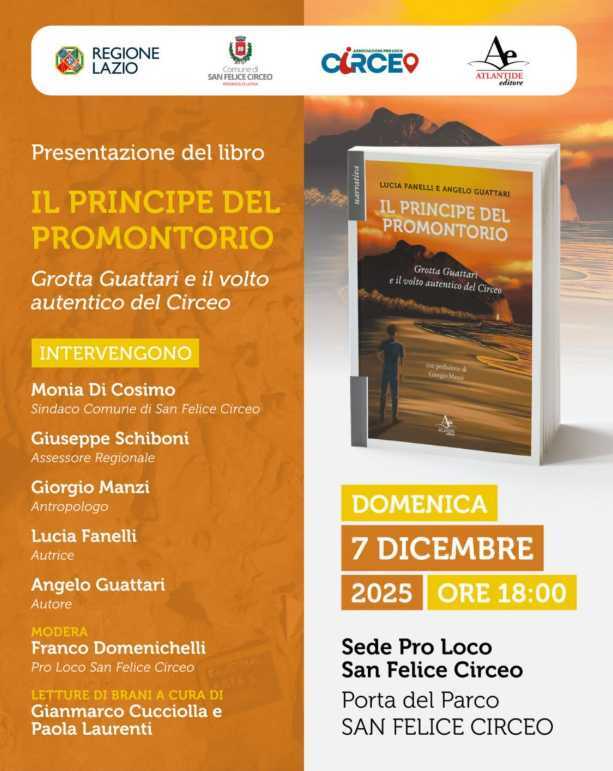 SAN FELICE CIRCEO – Si intitola Il principe del Promontorio (Atlantide Editore), il libro di Lucia Fanelli e Angelo Guattari, che sarà presentato domenica 7 presso la Porta del Parco a San Felice Circeo. Un viaggio tra storia, archeologia e identità del territorio. “Un’occasione speciale per approfondire la storia della straordinaria Grotta Guattari e scoprire il volto più autentico del nostro territorio”, spiegano dalla Pro Loco che organizza l’appuntamento.