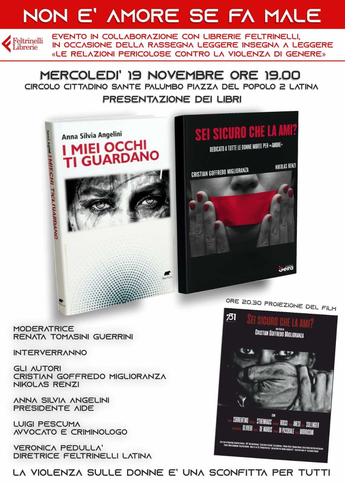 LATINA – Si terrà mercoledì 19 alle 19:00, presso il Circolo Cittadino Sante Palumbo in Piazza del Popolo a Latina, un evento dedicato alla sensibilizzazione e alla riflessione sulla violenza di genere, un fenomeno in continua ascesa nel nostro Paese con 78 femminicidi avvenuti, secondo gli ultimi dati dell’Osservatorio Eures, dall’inizio del 2025. L’iniziativa rientra nella rassegna nazionale “Le relazioni pericolose”, promossa da Feltrinelli, in occasione della Giornata Internazionale per l’eliminazione della violenza contro le donne del 25 novembre; una nuova campagna di sensibilizzazione che si propone di indagare le radici culturali alla base di un fenomeno, quello della violenza sulle donne, su cui tutte e tutti siamo chiamati a interrogarci. Nel corso della serata verranno presentati i libri “I miei occhi ti guardano” di Anna Silvia Angelini scrittrice, attivista impegnata nella lotta contro la violenza di genere, presidente dell’associazione AIDE Nettuno (Associazione Indipendente Donne Europee), e “Sei sicuro che la ami?” dello scrittore Nikolas Renzi e Cristian Goffredo Miglioranza, regista anche dell’omonimo lungometraggio a cui si è ispirato il libro.