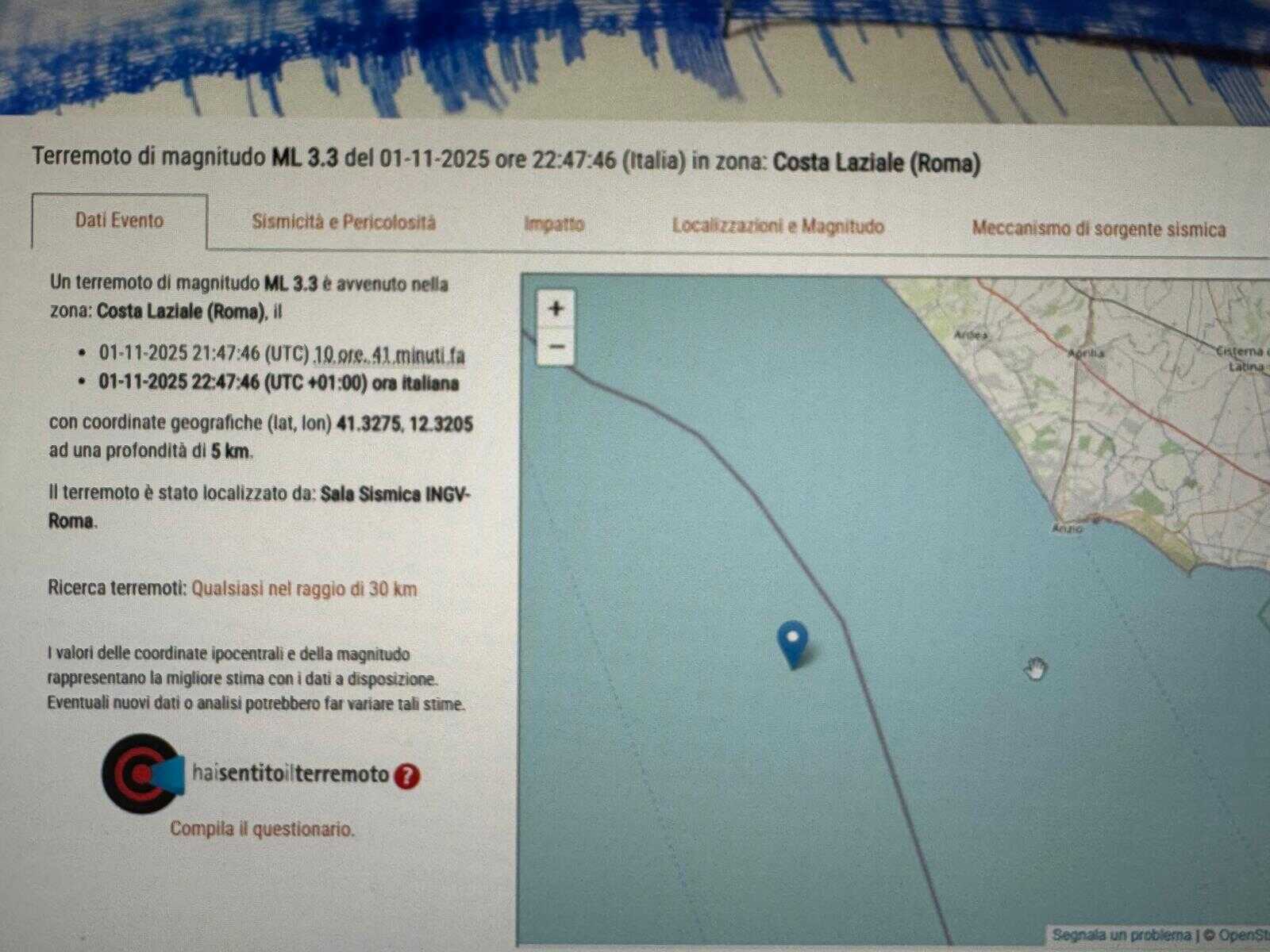 Scossa di terremoto di magnitudo 3.3 registrata ieri sera, sabato 1 novembre, alle ore 22:47, lungo la costa laziale.
