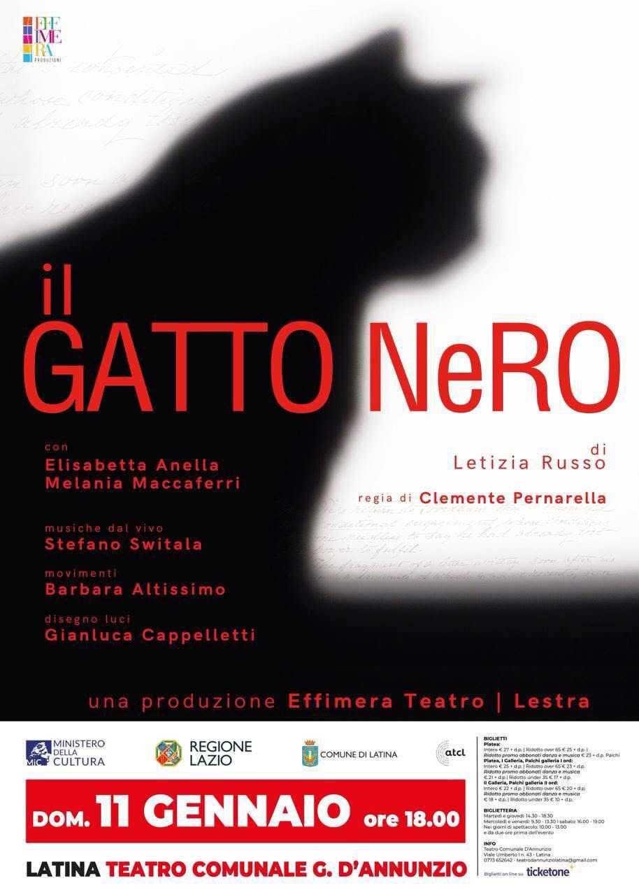 LATINA – E’ in programma per oggi domenica 11 Gennaio alle 18 “Il Gatto Nero” la rilettura drammatica del celebre racconto di Edgar Allan Poe con: Melania Maccaferri, Marta Jacquier, Elisabetta Anella; regia di Clemente Pernarella; musiche dal vivo di Stefano Switala; coreografia tecnica di Barbara Altissimo; disegno luci di Gianluca Cappelletti. Una prosa intensa e psicologica che esplora il rapporto tra violenza e affetto.