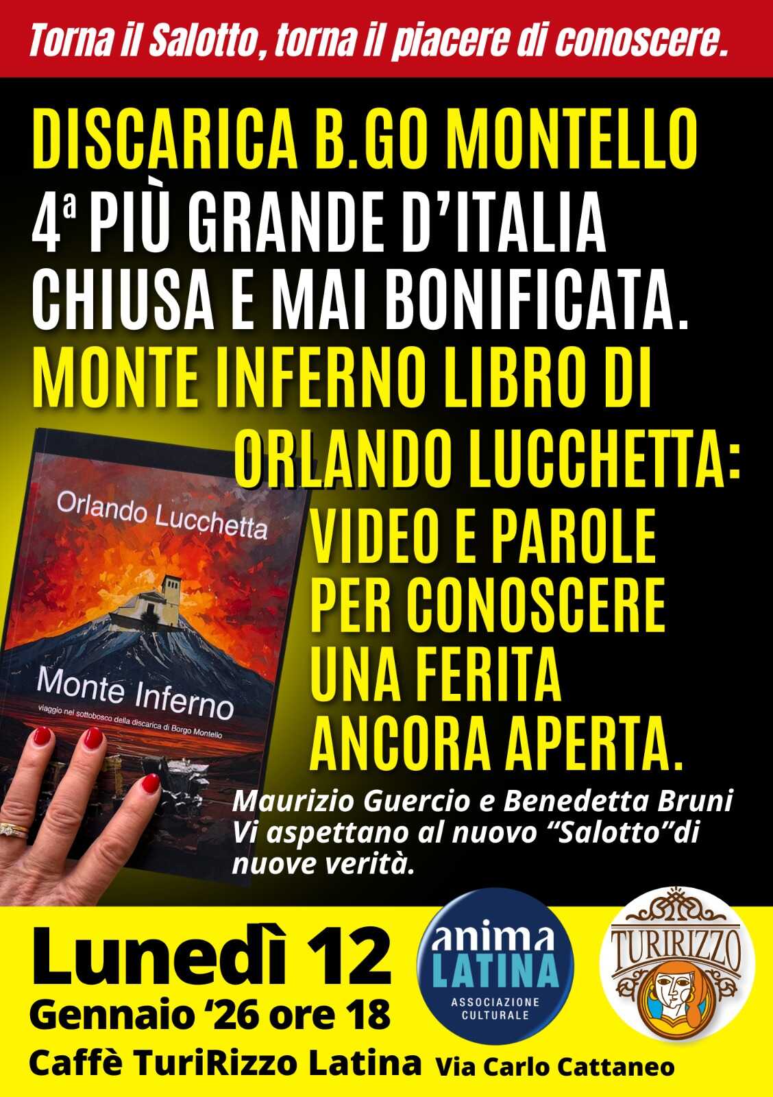 LATINA – Non una semplice presentazione editoriale, ma un momento pubblico di informazione e confronto su una delle vicende ambientali più rilevanti e inquietanti del territorio pontino. Così l’associazione Anima Latina presenta il prossimo “Salotto” di Maurizio Guercio e Benedetta Bruni, dedicato alla riflessione civile e culturale. Nel corso dell’appuntamento, in programma lunedì 12 gennaio al Caffè TuriRizzo alle 18, Orlando Lucchetta presenterà il suo “Monte Inferno”, vero e proprio dossier sulla discarica di Borgo Montello, la quarta più grande d’Italia.