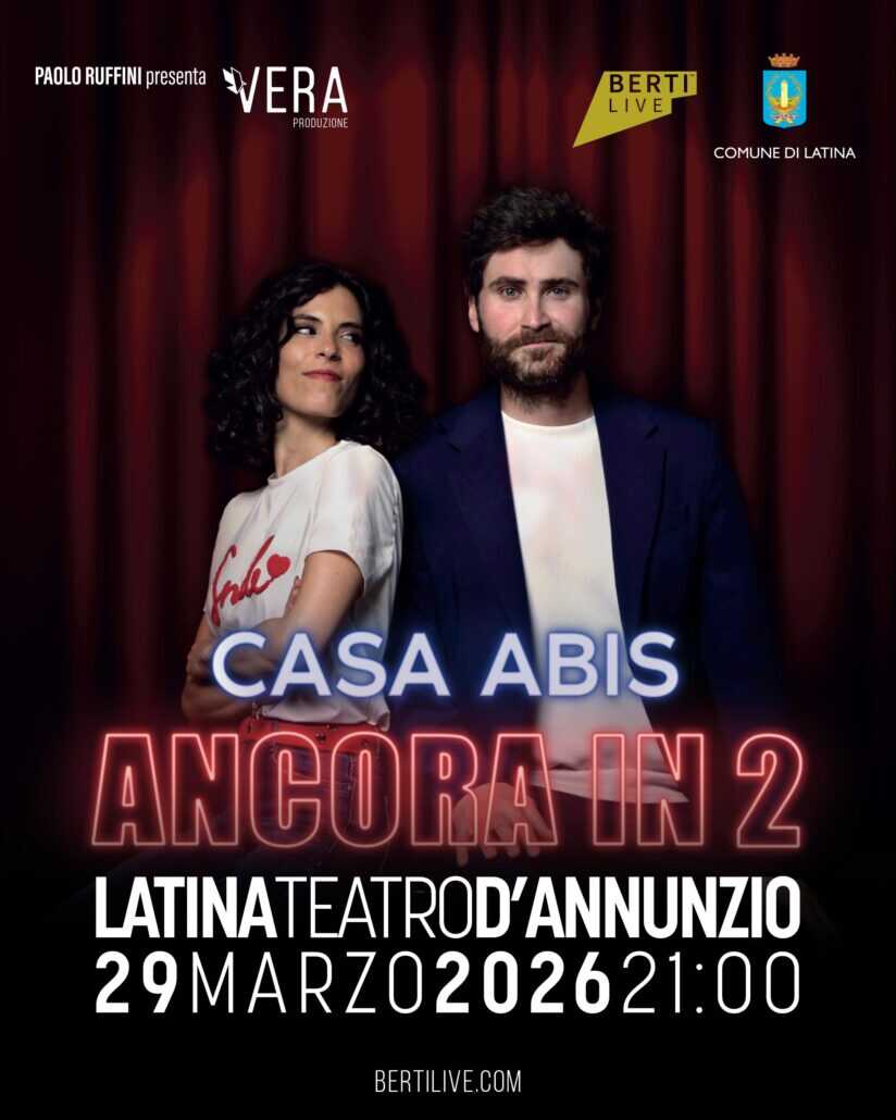 LATINA – Stella Falchi e Gabriele Abis, ovvero i Casa Abis, arrivano sul palco del Teatro Gabriele D’Annunzio di Latina con il loro nuovo spettacolo. Una commedia ironica, tenera e spietata sulla vita di coppia: “Si parte dal matrimonio – raccontano – e si attraversano, senza filtri, le tappe della convivenza, i microtraumi della quotidianità, le aspettative degli altri, le crisi, i compromessi… e quella misteriosa forza che spinge due persone a restare insieme”.