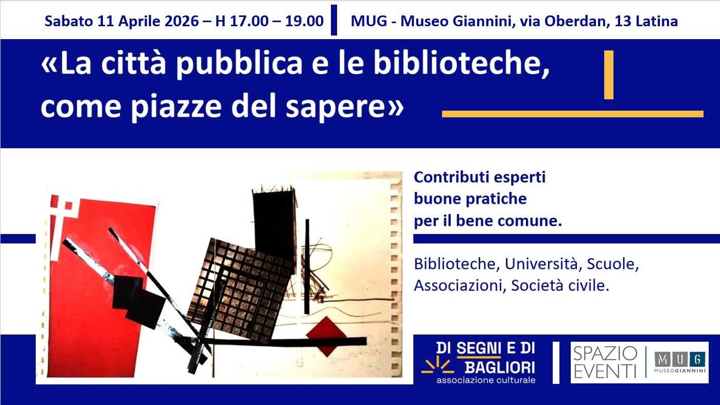 LATINA – Sabato 11 aprile 2026, dalle ore 17.00 alle 19.00, presso il MUG – Museo Giannini (via Oberdan 13, Latina), l’Associazione di segni e di bagliori promuove un incontro pubblico dedicato al ruolo delle biblioteche nella costruzione della città pubblica.