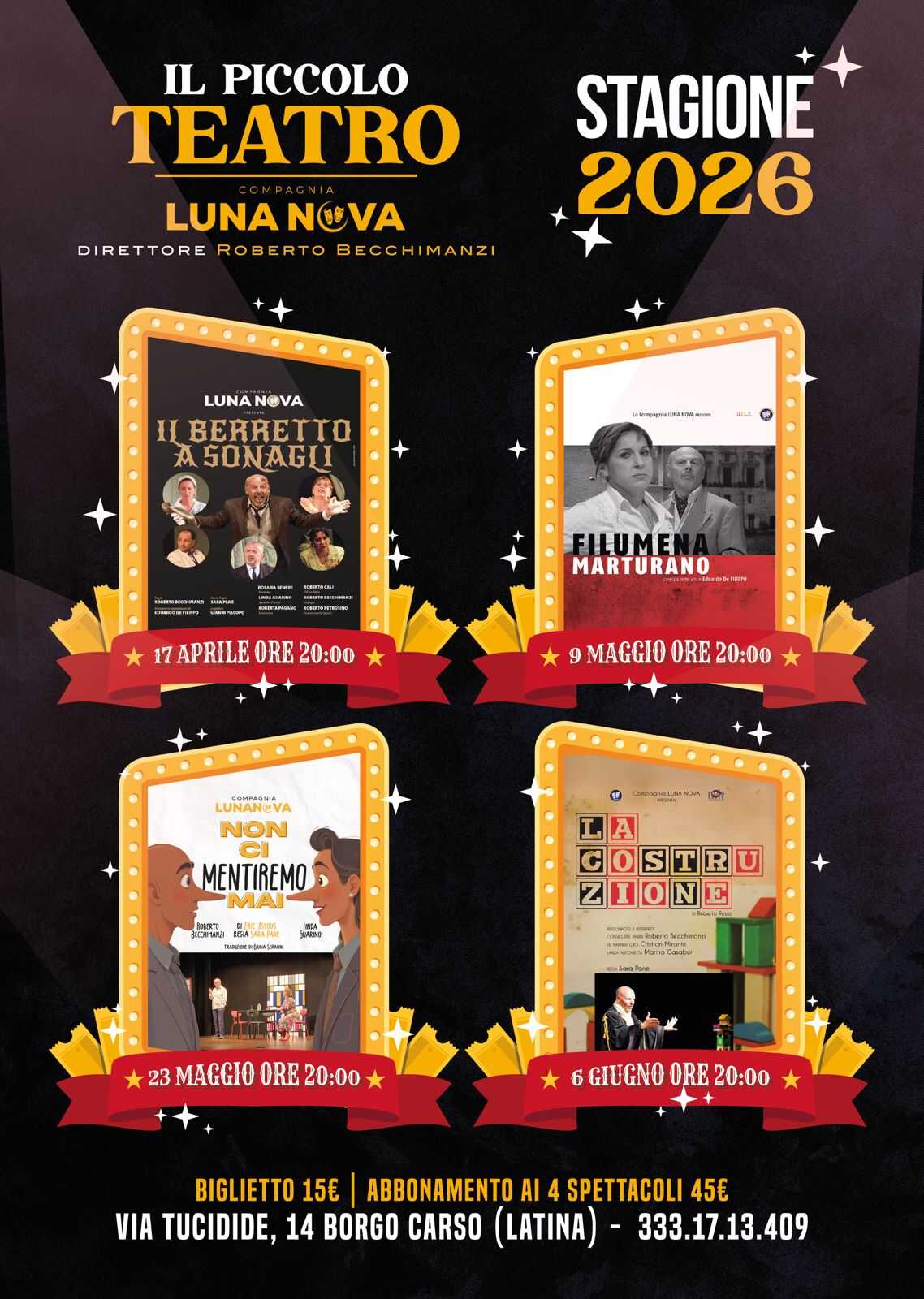 In occasione dell’apertura, il teatro ospiterà una prima rassegna composta da quattro spettacoli del repertorio della Compagnia Luna Nova, Quattro titoli che raccontano bene l’identità artistica tra grandi classici, drammaturgia contemporanea e attenzione alla parola scenica.