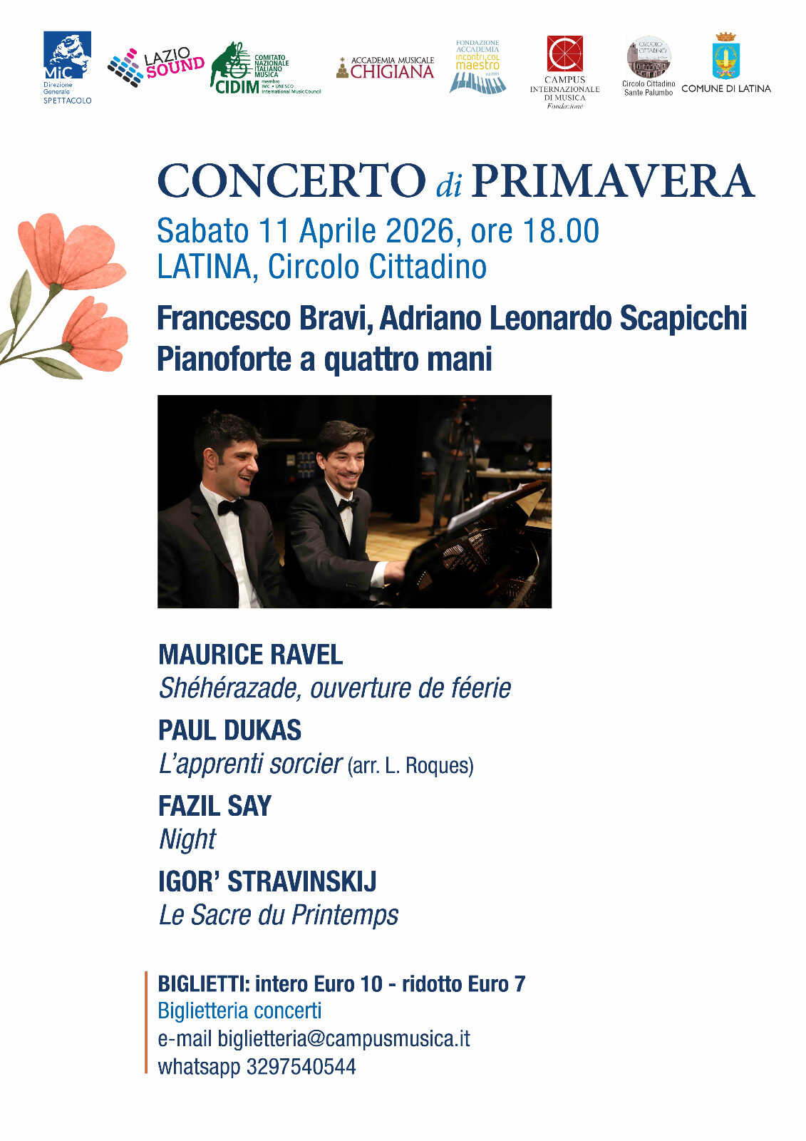 “Siamo lieti di tornare a collaborare con il CIDIM – annuncia la Presidente del Campus Elisa Cerocchi – e di accogliere a Latina il duo pianistico Francesco Bravi e Adriano Leonardo Scapicchi per questo Concerto di Primavera che si terrà al Circolo Cittadino Sante Palumbo sabato 11 aprile, alle ore 18.00. Il duo sta per concludere un lungo tour, iniziato un anno fa, realizzato dal CIDIM, nell’ambito del progetto LAZIOSound, finanziato dalle Politiche Giovanili della Regione Lazio e dalla Presidenza del Consiglio dei Ministri. Latina sarà la penultima tappa per i due talentuosi musicisti”.