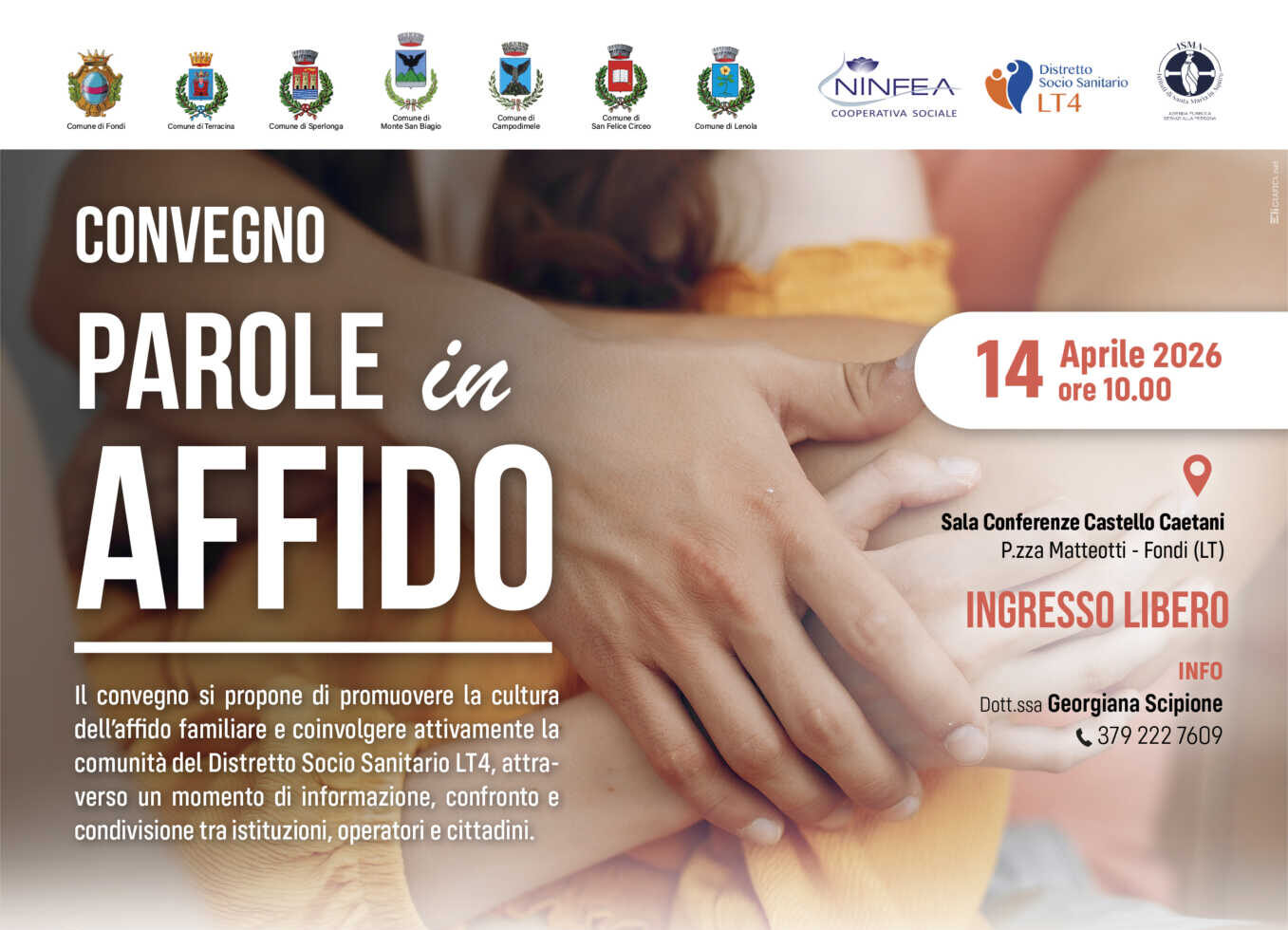 FONDI – Martedì 14 aprile il Castello Caetani di Fondi ospiterà un convegno dal titolo “Parole in Affido”, inserito nell’omonimo progetto del Distretto LT4 finanziato dall’ISMA, Istituti di Santa Maria in Aquiro, e gestito da Ninfea Cooperativa Sociale. L’evento (a ingresso libero) è rivolto a tutta la cittadinanza per approfondire i contenuti e le finalità dell’Affido Familiare, uno strumento temporaneo di aiuto e sostegno a minori provenienti da famiglie in difficoltà. Attraverso interventi ed esperienze di professionisti, operatori e famiglie affidatarie – spiegano dalla cooperativa sociale – si potrà vivere un momento di confronto reale volto a coinvolgere attivamente la comunità e a favorire una condivisione tra istituzioni, addetti ai lavori e cittadini. L’iniziativa rientra in un progetto più ampio elaborato dal Distretto Sanitario LT4, destinato a raggiungere e coinvolgere i Comuni che ne fanno parte: dal capofila Fondi a Terracina, Lenola, Monte San Biagio, San Felice Circeo e Sperlonga.