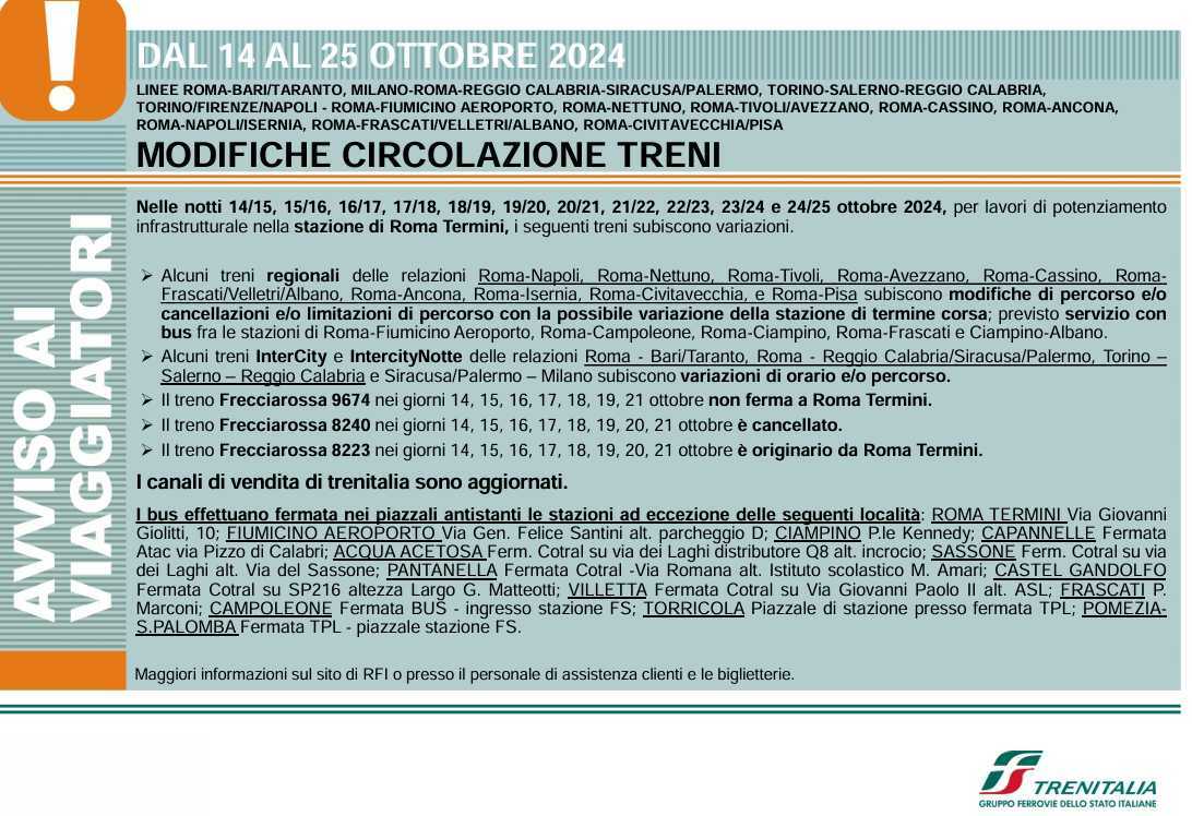 LATINA – RFI, Rete Ferroviaria Italiana, comunica variazioni alla circolazione dei treni per tutta la settimana in corso e fino a giovedì 25 ottobre in orario notturno.