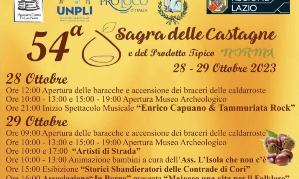 NORMA – Con l’autunno, torna a Norma, il 28 e 29 ottobre, la Sagra delle Castagne e del prodotto tipico, 54° edizione della festa popolare lepina...