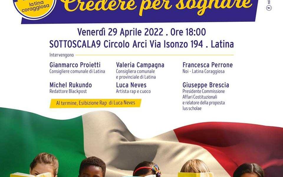 LATINA – “Ius scholae: Credere per sognare” è il titolo dell’evento, organizzato dall’associazione Noi – Latina Coraggiosa, che si terrà oggi 29 aprile, ore 18.00, al...