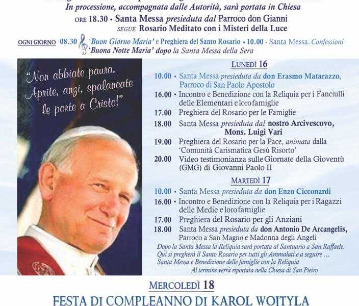 FONDI – L’ampolla con il sangue reliquia di San Giovanni Paolo II arriverà domenica 15 maggio a Fondi per aprire quattro giornate di fede per il...