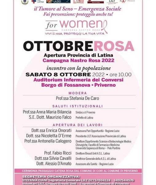 PRIVERNO – Si è aperta ufficialmente nell’Auditorium Infermeria dei Conversi Borgo di Fossanova a Priverno l’edizione 2022 di Ottobre Rosa, a campagna di sensibilizzazione sul tumore...